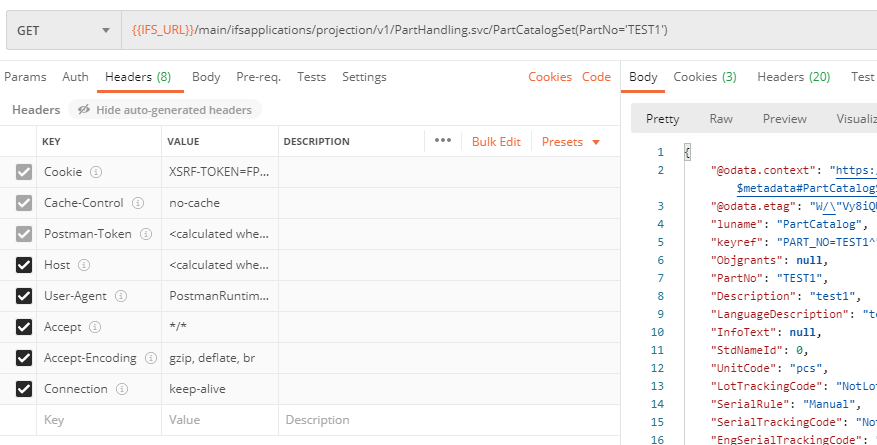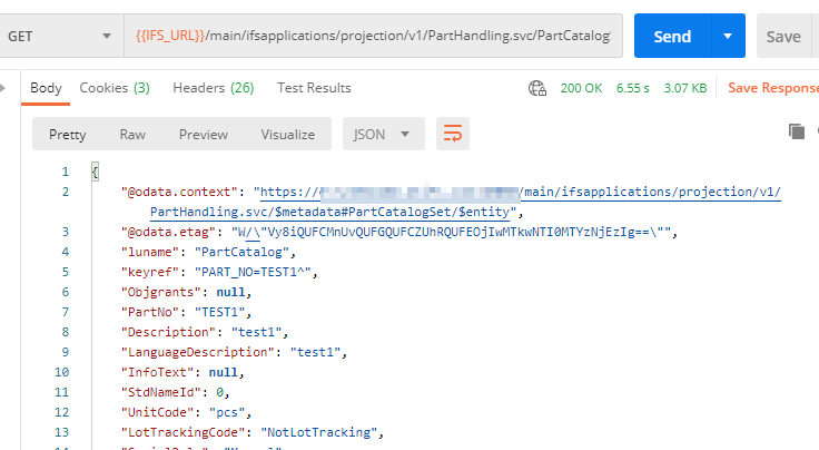 {{IFS_URL}}/main/ifsapplications/projection/v1/PartHandling.svc/PartCatalogSet(PartNo='TEST1')