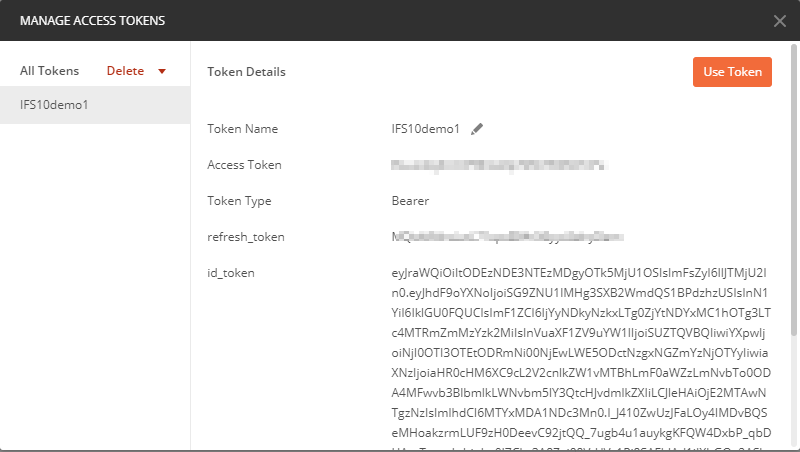 IFS requires ID token, not the access token. It’s arguable whether it’s correct approach according to the OAuth 2.0 protocol but we have to deal with it anyway. If you press Use token, Postman will use the Access token. What you need to do is, copy the ID token and paste in the Access Token field.