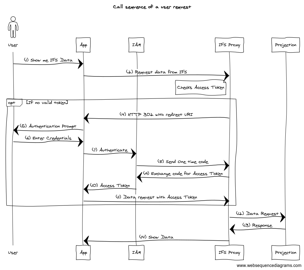 Below is the call sequence to get data from IFS projection to the user. If there’s no valid token present with the request, IFS Proxy redirects the request for authentication (steps 4 to11).