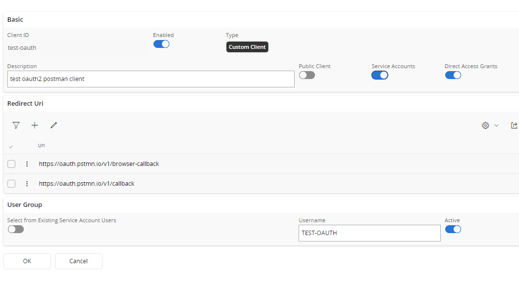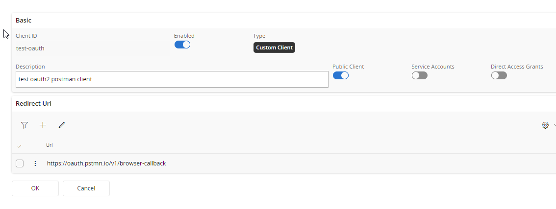 In order to connect to IFS via any client, client needs to register and register the callback URL. Go to IAM Client in IFS Cloud (Solution Manager > Users and Permissions > Identity and Access Manager > IAM Client) and Press + to create a new client. Fill the details as below and add the postman default callback URLs as the redirect Uri. Enable the client and Save.