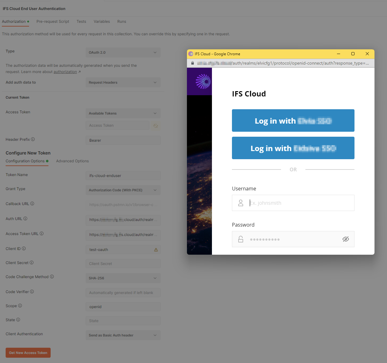 Press Get New Access Token and if you provided all necessary details and your IAM client is enabled, you should get the IFS login dialog as below. Provide username and password and then you should get the access token back!