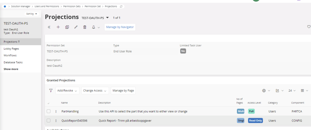 I’ve created a new End User Permission set and added the Projection (PartHandling) I wanted to call with this service user and added that permission set to the user