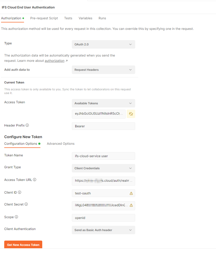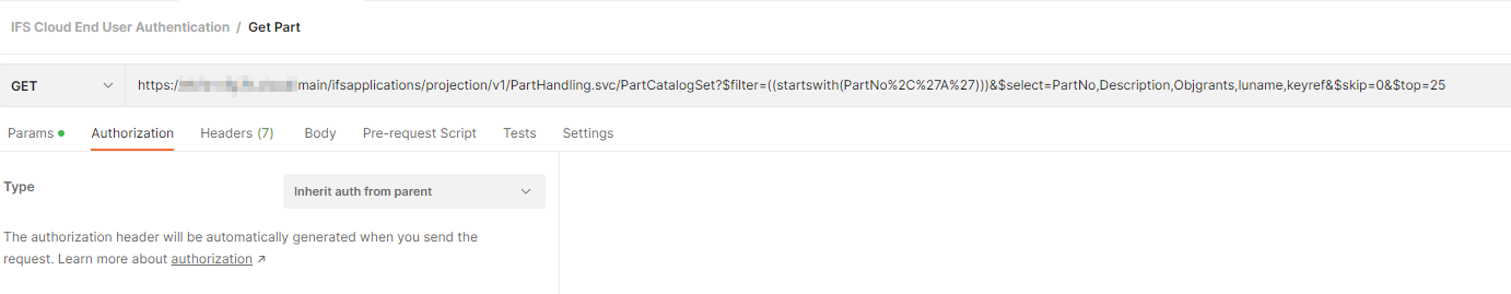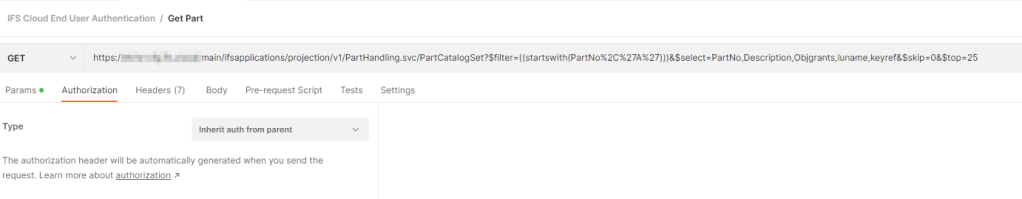 Now this access token can be used to call IFS Projections. In the request, make sure Authentication is set to inherit from parent