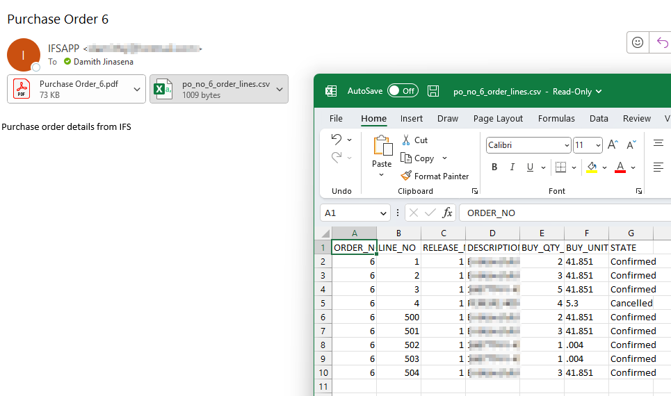I have tried granting a permission set containing Admin System Privilege to the end user and IFSConnect (I cant edit the FNDCONNECT permission set) but still only receive the email with the standard PDF report and not the additional PDF against the Line/Purchase Part.