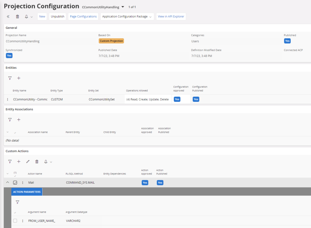 I couldn’t find a standard projection action which exposed the Command_SYS.mail procedure so I decided to create a custom entity and a custom projection. It’s possible to add this to any existing projection as well but since sending mail is a common function, I thought it could be good to have it separately so we could use the send mail functionality without affecting other business areas.