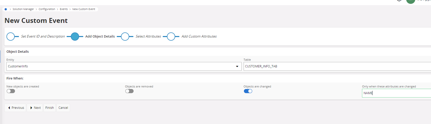 Select Fire When as Objects are changed and add NAME as the attribute to change so our event will trigger only when the Customer name is changed.