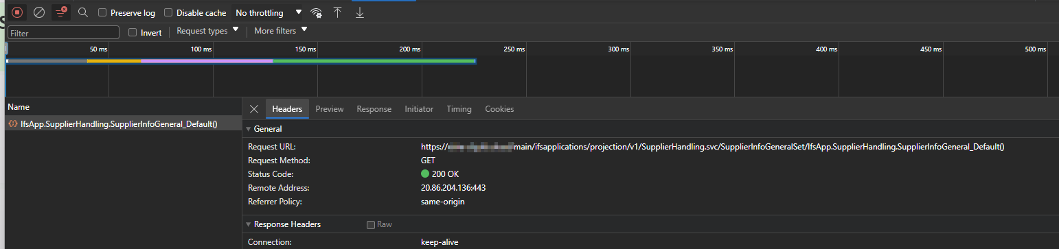 You can open the browser DevTools or the IFS log window, and press New record button. It will list down the projection calls made to get the default values. My personal choice is DevTools and in the Network tab, you can see the the projection call to get the default values and the response.