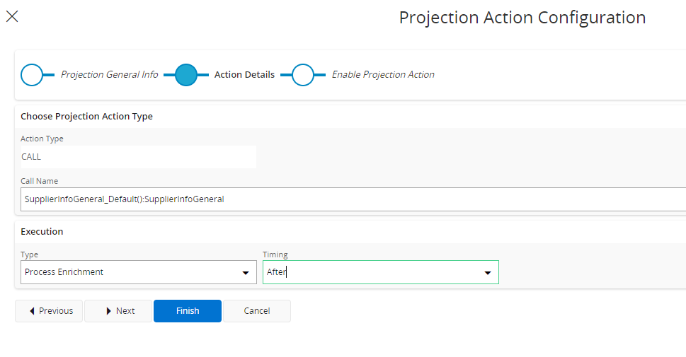 • Add a new Projection action and put SupplierHandling as the Projection Name.
