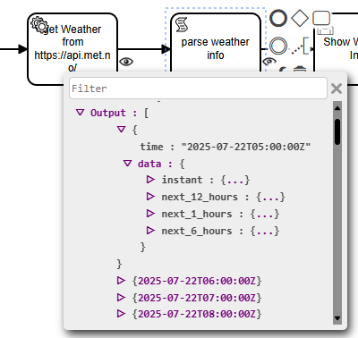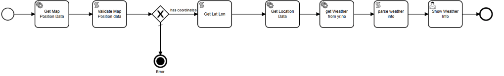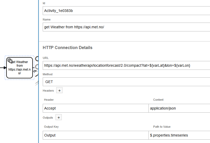 Core of this workflow is to get the weather information for a given location. We used the Norwegian MET Weather API since the customer is located on Norway and the API if free to use without any subscription.