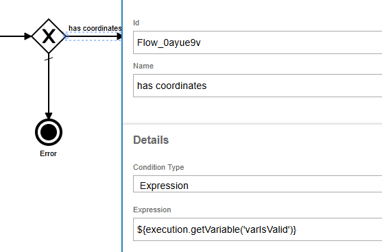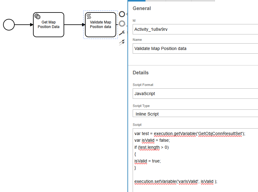 If the call to get the map positions has values, the workflow proceed to execute by checking the isValid variable set in the above script task.