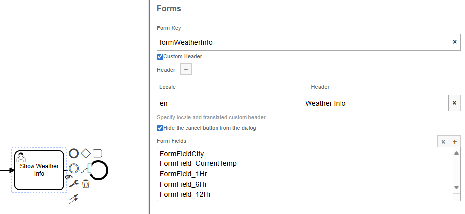 Last step of the workflow is to show the weather forecast to user using a dialog box. A User task was used for this, and the weather forecast was shown to the user using several form fields.